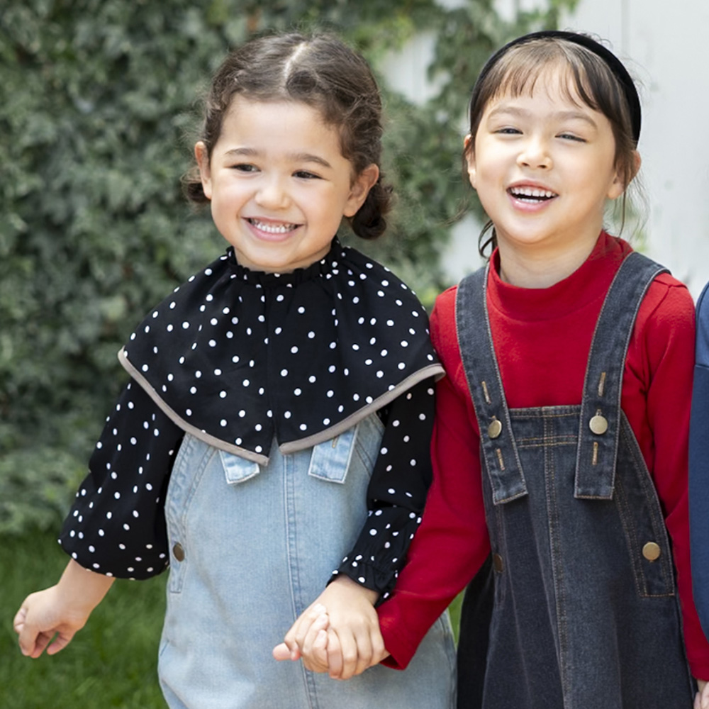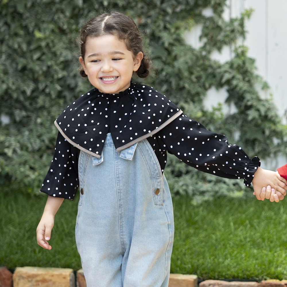 クラシカルな大きな襟がポイントで、襟ぐりや袖口はゴム入りで着脱も楽々♪