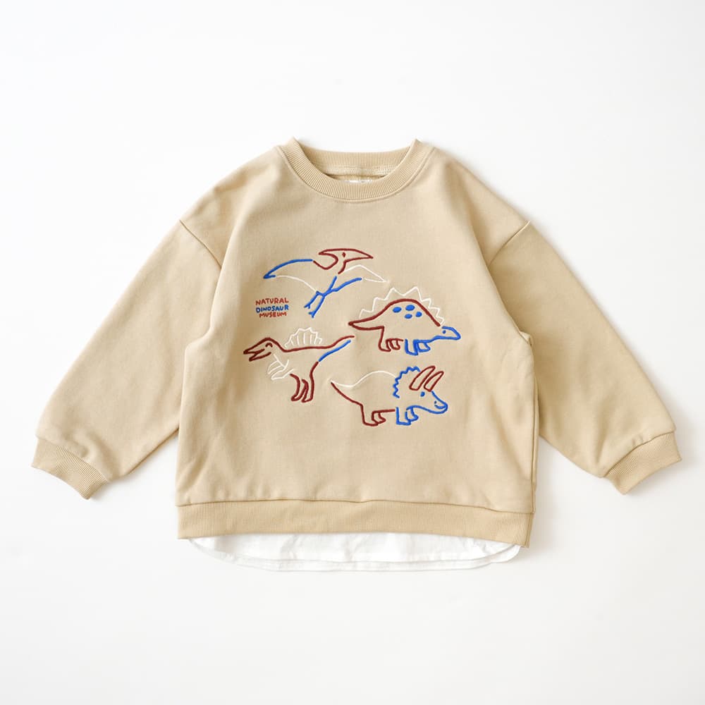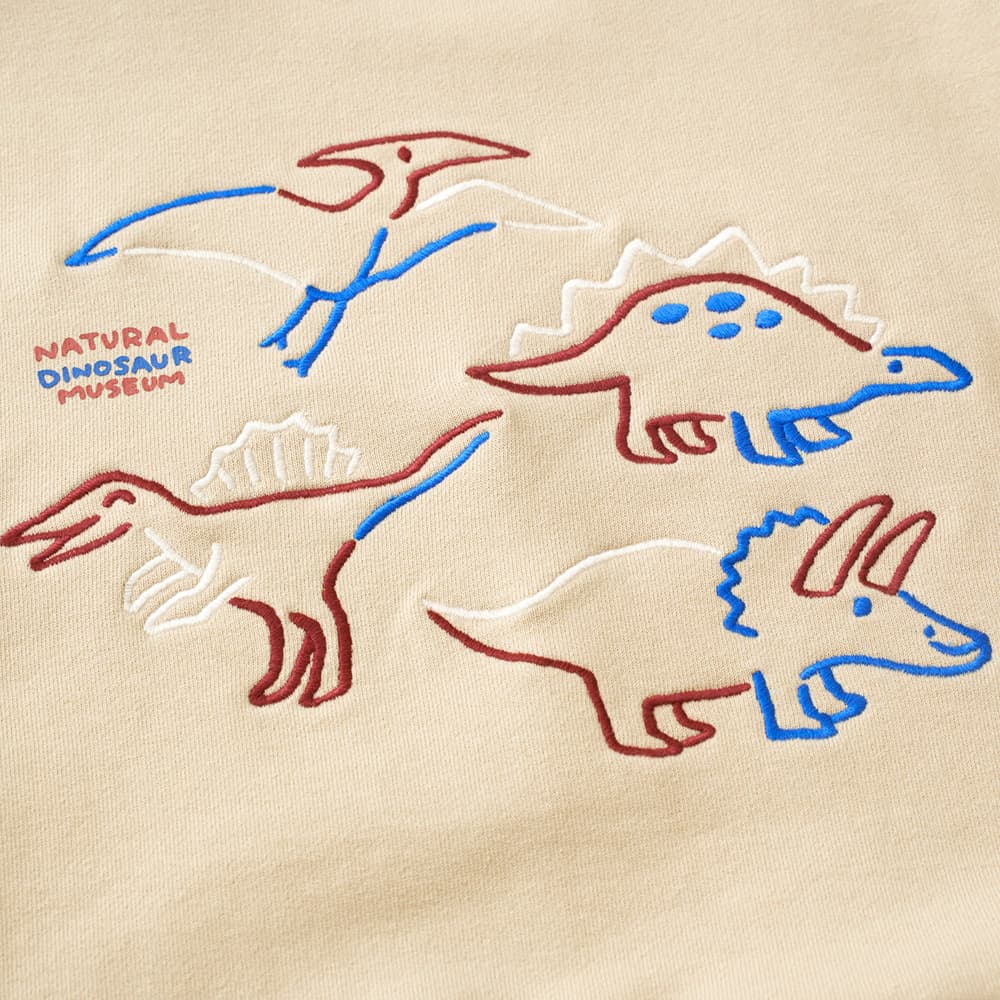 - 手書き風の恐竜柄に、配色の効いた刺繍を取り入れました♪